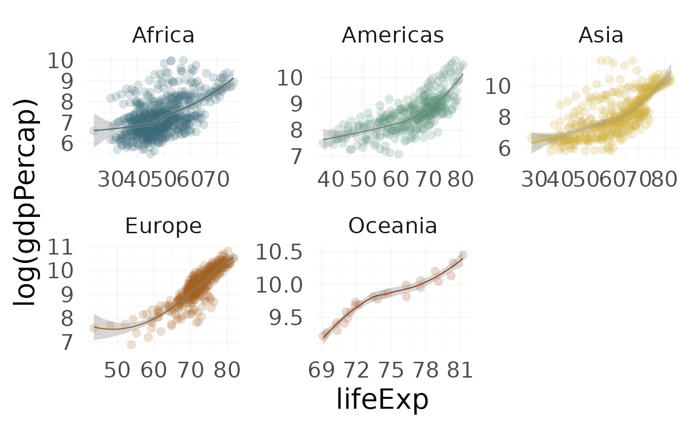 ggplot(gapminder, aes(x = lifeExp, y = log(gdpPercap), colour = continent)) +