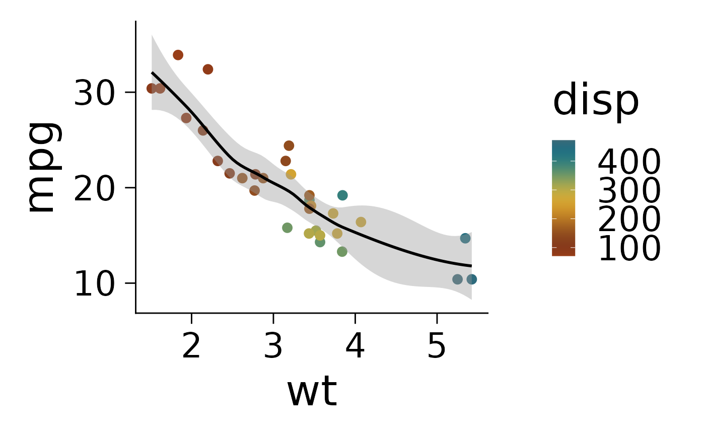 ggplot(mtcars, aes(wt, mpg, colour = disp)) +